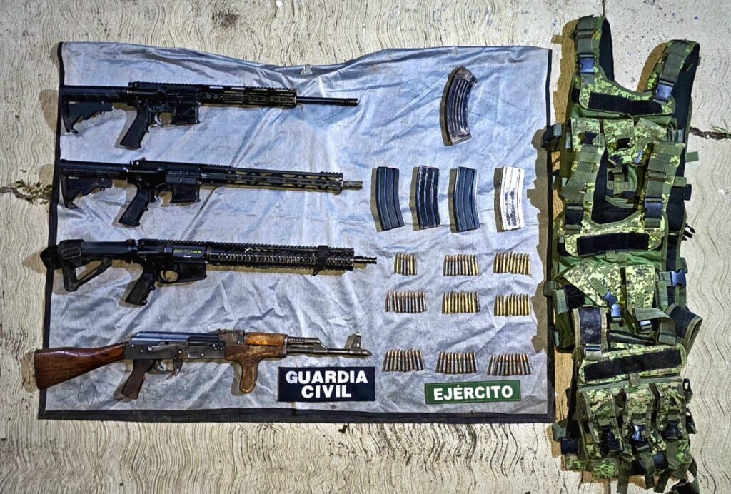 En su interior aseguraron tres armas de fuego calibre 5.56 milímetros y una calibre 7.62X39 milímetros, además 86 cartuchos útiles y cinco cargadores; mismos que fueron puestos a disposición de la autoridad competente junto con los automotores.