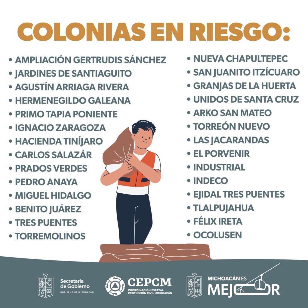 En tanto, Protección Civil del Estado indicó que se mantiene el llamado de alerta en 43 colonias morelianas ante la posibilidad de desbordes en caso de ser necesarios nuevos desfogues de la presa de Cointzio.