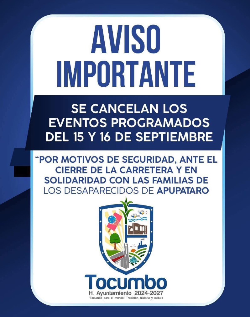 A través de un aviso a la ciudadanía, la administración municipal de Tocumbo dio a conocer la decisión de cancelar los eventos patrios por “motivos de seguridad”.