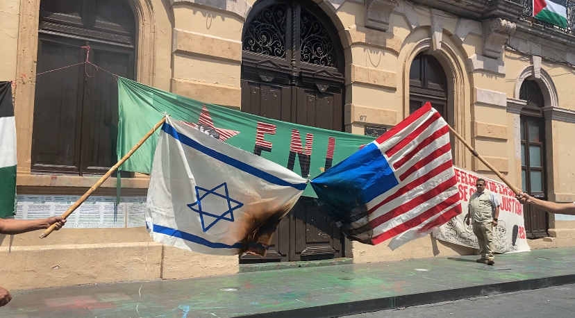 Al manifestarse este mediodía en el exterior del recinto legislativo donde se quemaron mantas representativas de las banderas de Israel y Estados Unidos, integrantes del Frente Nacional de Lucha por el Socialismo (FNLS) solicitaron que la 76 Legislatura del Congreso local emita un exhorto dirigido a la presidenta Claudia Sheinbaum para que México rompa relaciones con el estado israelí.