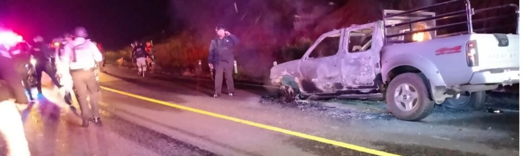 En la zona se encontraron un Nissan Tsuru blanco, chocado; un autobús línea VIP Marverth, con las llantas ponchadas e impactos de arma; una plataforma internacional en color blanco, con impactos de arma; y una Nissan Frontier gris, calcinada.