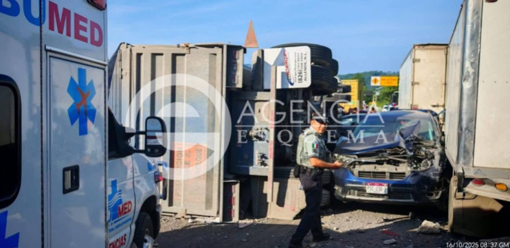 Fue precisamente este accidente el que provocó que el conductor de un tractocamión frenara de manera sorpresiva, por lo que un vehículo compacto Kia, color rojo se estrelló en la retaguardia y éste a su vez fue impactado por otro tractocamión de la empresa Carga Super Express, con placas 17-UY-2D.