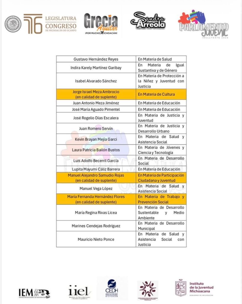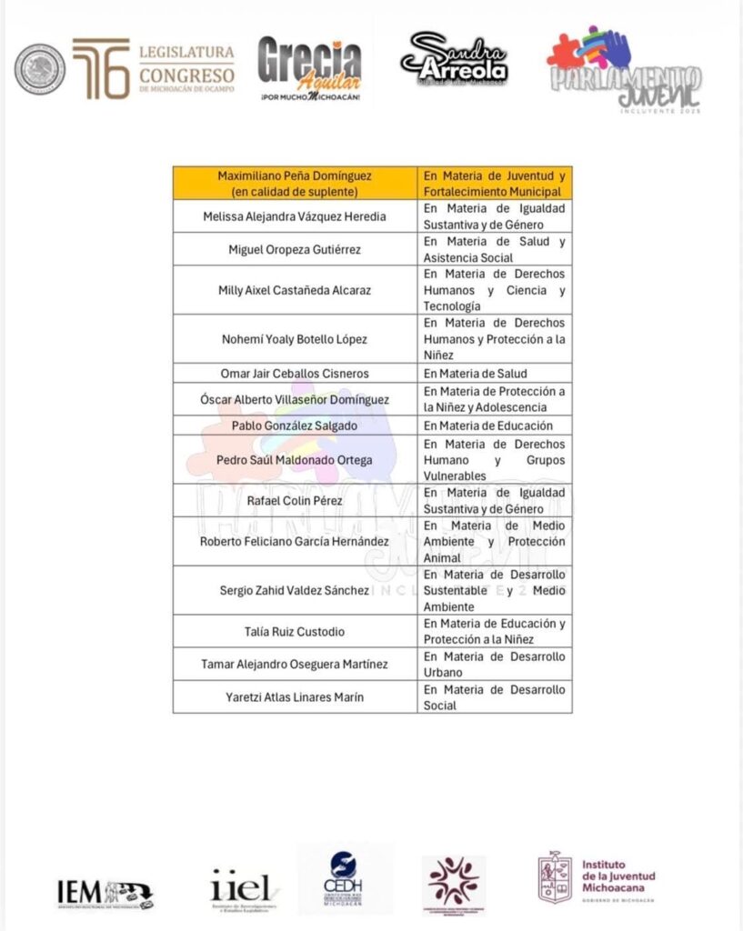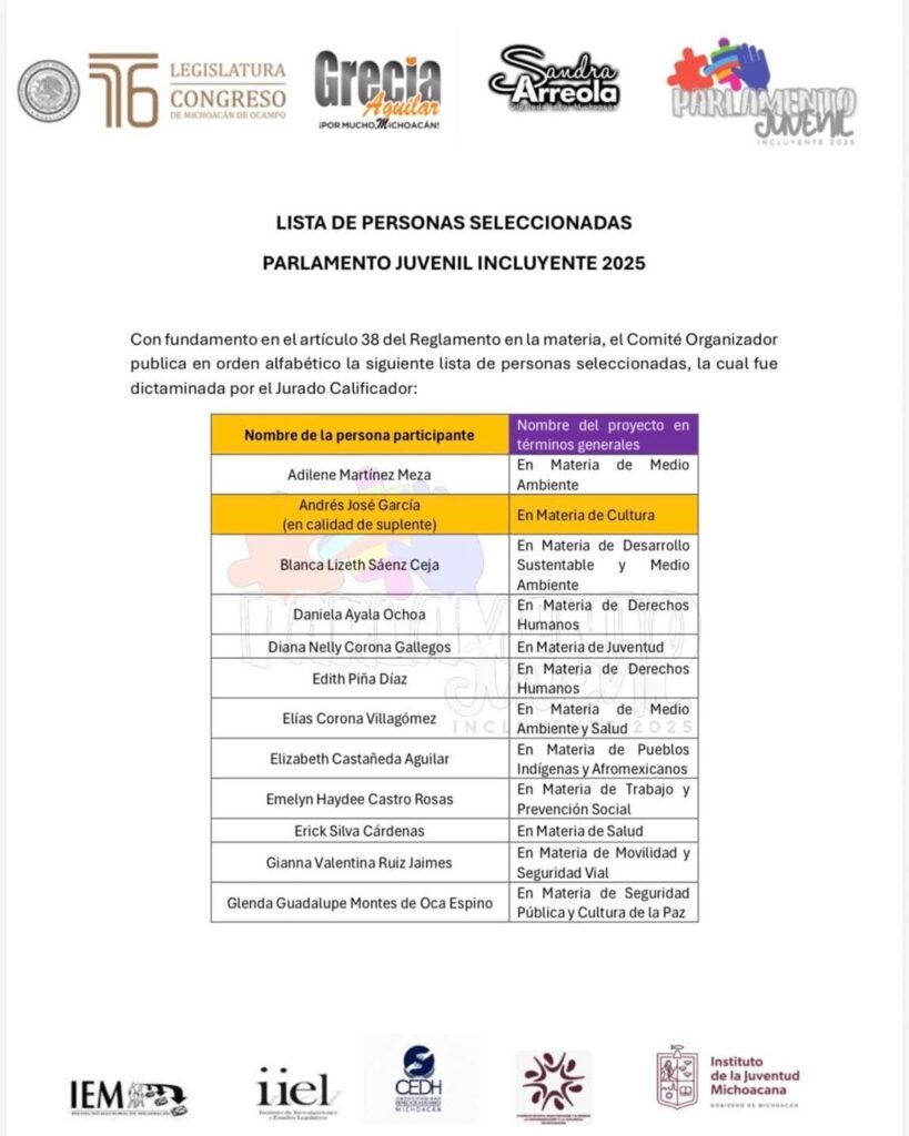 Tras reconocer la participación de las y los jóvenes, la diputada Grecia Jennifer Aguilar Mercado, presidenta del Comité Organizador del Parlamento Juvenil Incluyente 2025, dio a conocer la lista de las y los seleccionados que formarán parte de este importante ejercicio de participación democrática, incluyente y transformadora.