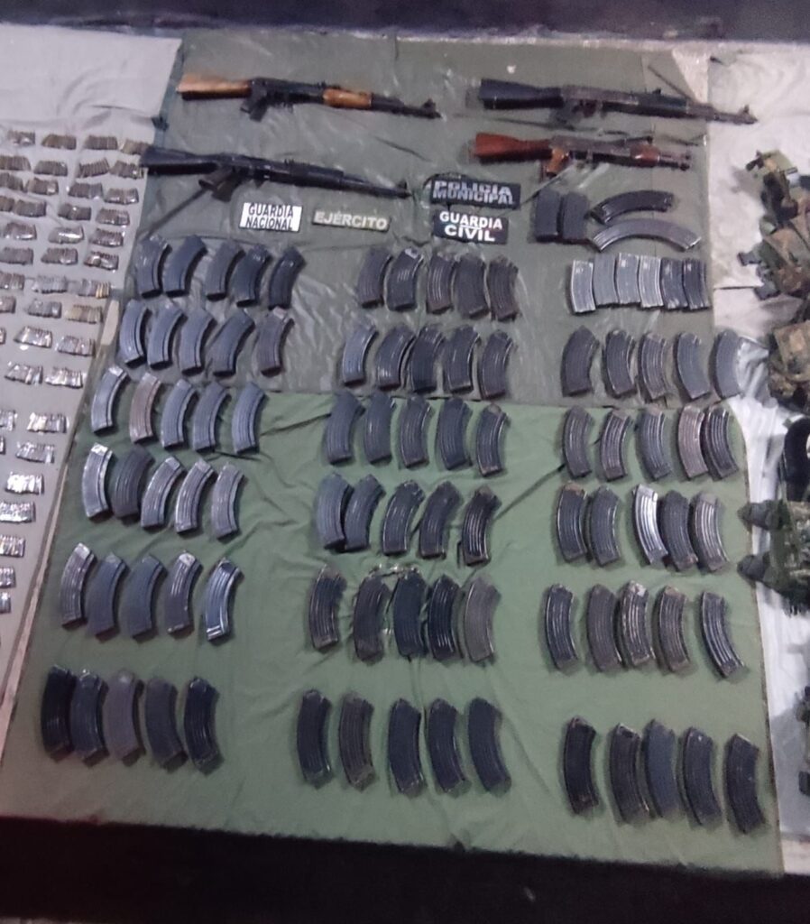 En un primer suceso efectuado, en la localidad 5 de Mayo, los elementos de la Guardia Civil, el Ejército Mexicano y la Guardia Nacional decomisaron cuatro armas de fuego calibre 7.62X39 milímetros, mil 850 cartuchos útiles, 95 cargadores, cascos y chalecos balísticos, así como una camioneta marca Nissan.