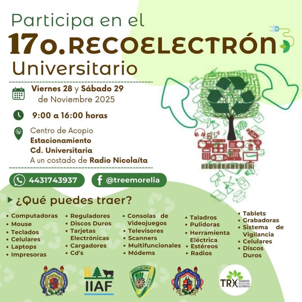 Este próximo 28 y 29 de noviembre se llevará a cabo una edición más del Recoelectrón Universitario que realiza la Universidad Michoacana de San Nicolás de Hidalgo (UMSNH), por lo que se invita a la comunidad nicolaita, así como a la población en general a participar activamente en esta actividad en favor del medio ambiente.