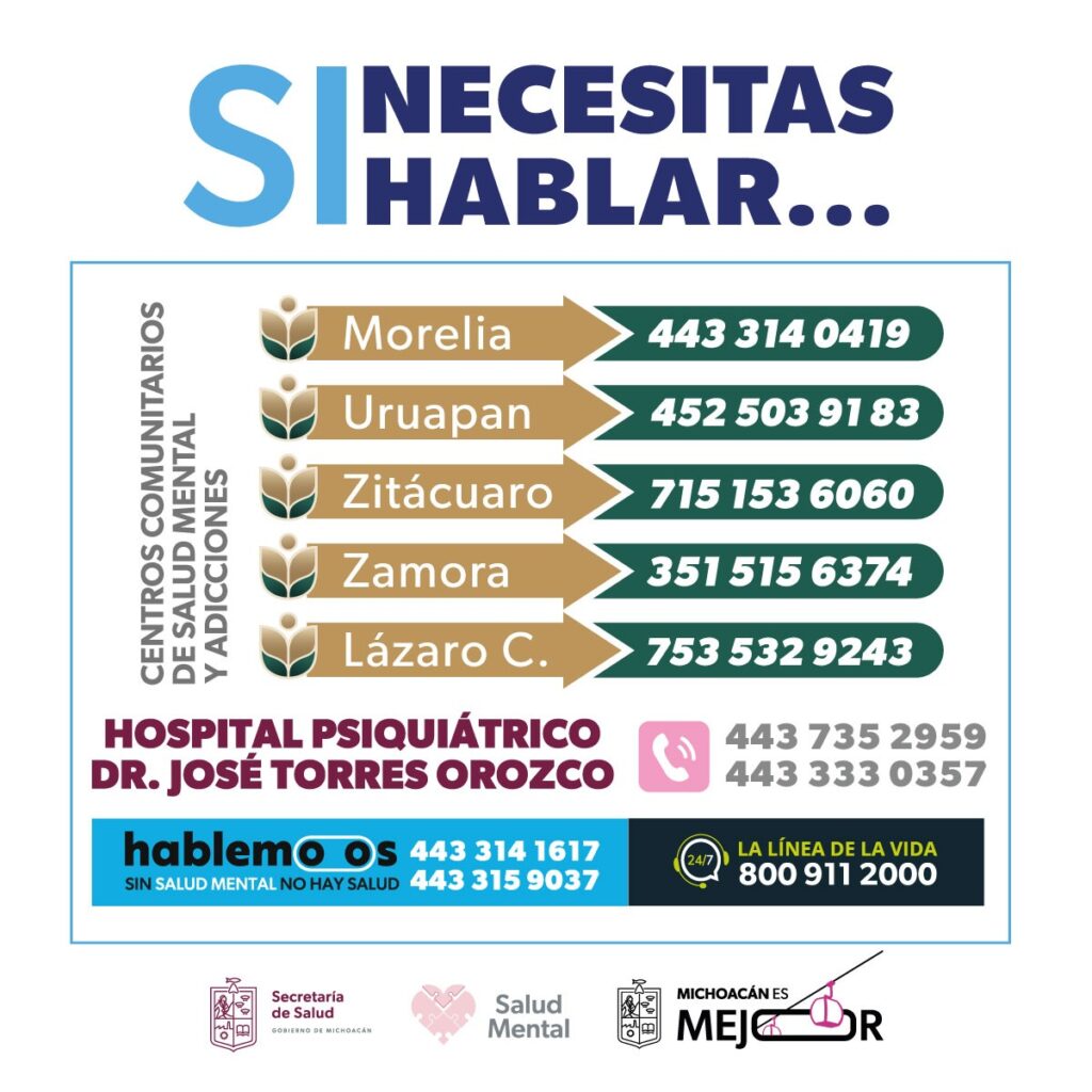 La SSM invita a quienes identifiquen estos síntomas en sí mismos o en sus seres queridos a buscar apoyo de inmediato, pueden comunicarse a la línea telefónica Hablemoos que ofrece atención inmediata, confidencial y gratuita por personal especializado, a los números 443 314 1617 y 443 315 9037.