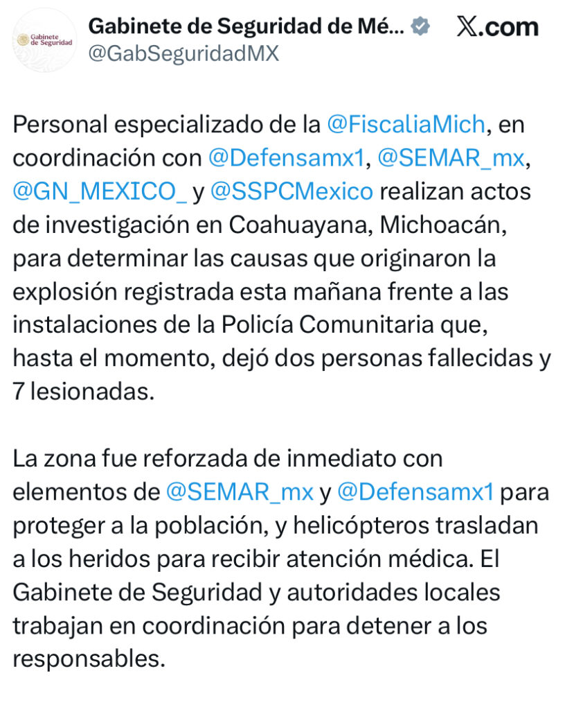 Sin que se dieran mayores detalles, el gabinete de Seguridad Federal hizo referencia al hecho y afirmó que se desplazó a un contingentes de agentes federales para brindar atención a las víctimas y resguardar la zona.