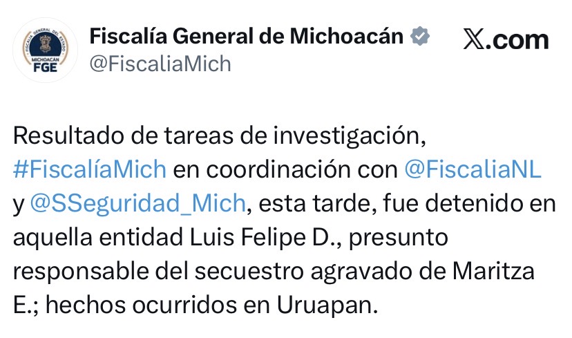 Luis Felipe D., el presunto feminicida de Maritza, su ex pareja y cuyo clero fue encontrado en en un tambo tirado en un río de Uruapan, fue capturado en el estado de Nuevo León este jueves, luego de una acción coordinada entre Michoacán y aquella entidad.