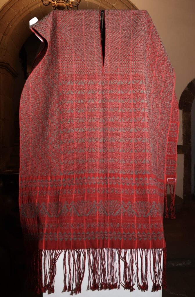 Otro de los premios principales, el galardón Occidente, fue para un gabán en telar de cintura de lana y algodón rojo con gris que elaboro la maestra artesana Angela Perucho Amado de la localidad de Angahuan.