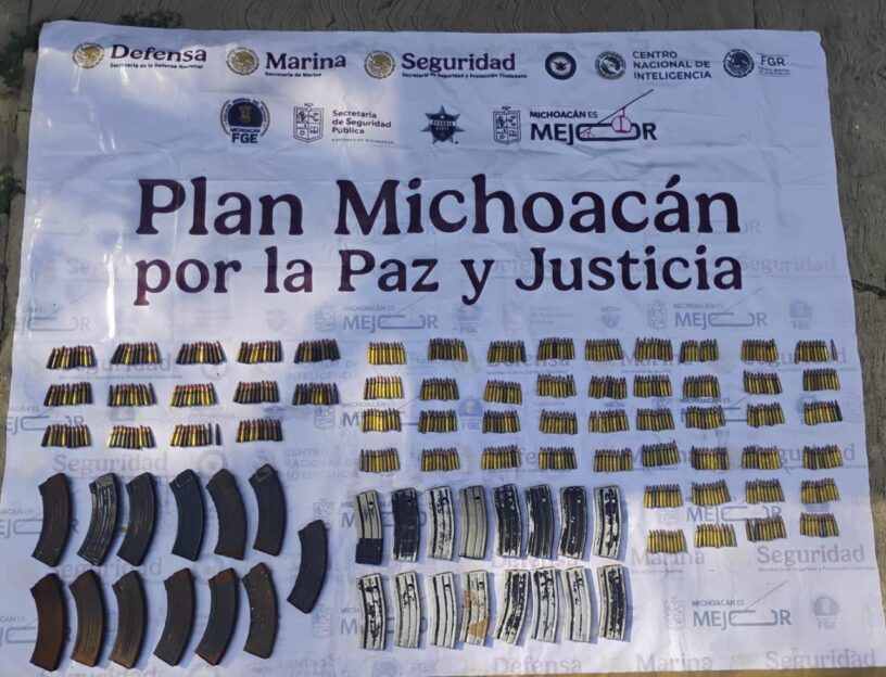 Producto de tareas operativas del Plan Michoacán por la Paz y la Justicia, agentes de las secretarías de Seguridad Pública (SSP) y de la Defensa Nacional (Defensa), destruyeron un campamento ilícito y aseguraron 560 cartuchos útiles, cargadores, equipo táctico y tres vehículos, dos con reporte de robo.