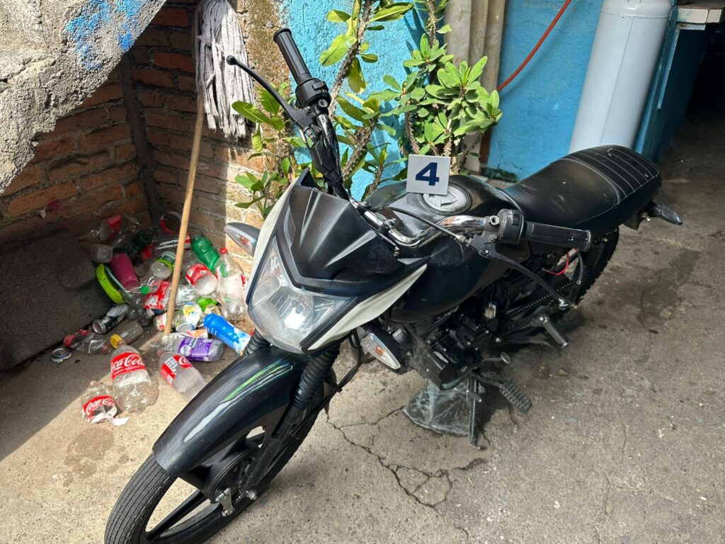Durante el cateo fueron asegurados dos envoltorios de plástico que contenían sustancia granulosa cristalina con las características de la metanfetamina; un cigarro artesanal con vegetal verde con las características de la marihuana; una pipa de cristal con residuos de sustancias para ahumamiento; una motocicleta marca Italika, color negro, con reporte de robo; así como dos teléfonos celulares.