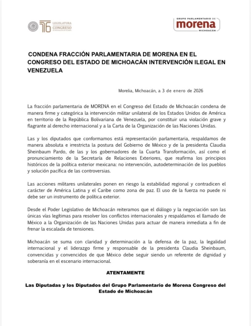 Diputados integrantes de la fracción parlamentaria de MORENA en el Congreso del Estado de Michoacán condena de manera firme y categórica la intervención militar unilateral de los Estados Unidos de América en territorio de la República Bolivariana de Venezuela, por constituir una violación grave y flagrante al derecho internacional y a la Carta de la Organización de las Naciones Unidas.