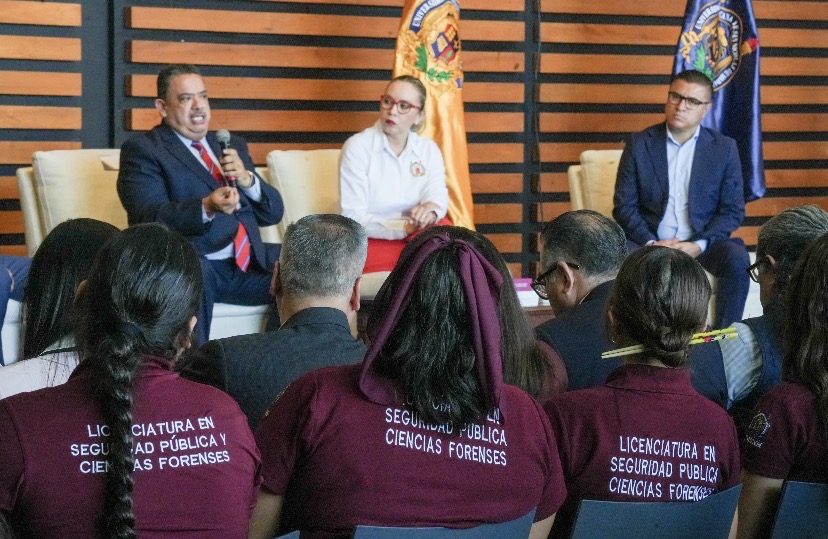 La rectora reconoció la trayectoria de ambos funcionarios, a quienes agradeció su participación en esta actividad dirigida a alumnas y alumnos de las licenciaturas en Derecho, en Seguridad Pública y Ciencias Forenses, y en Psicología, con quienes compartieron sus conocimientos en aras de fortalecer su formación académica.