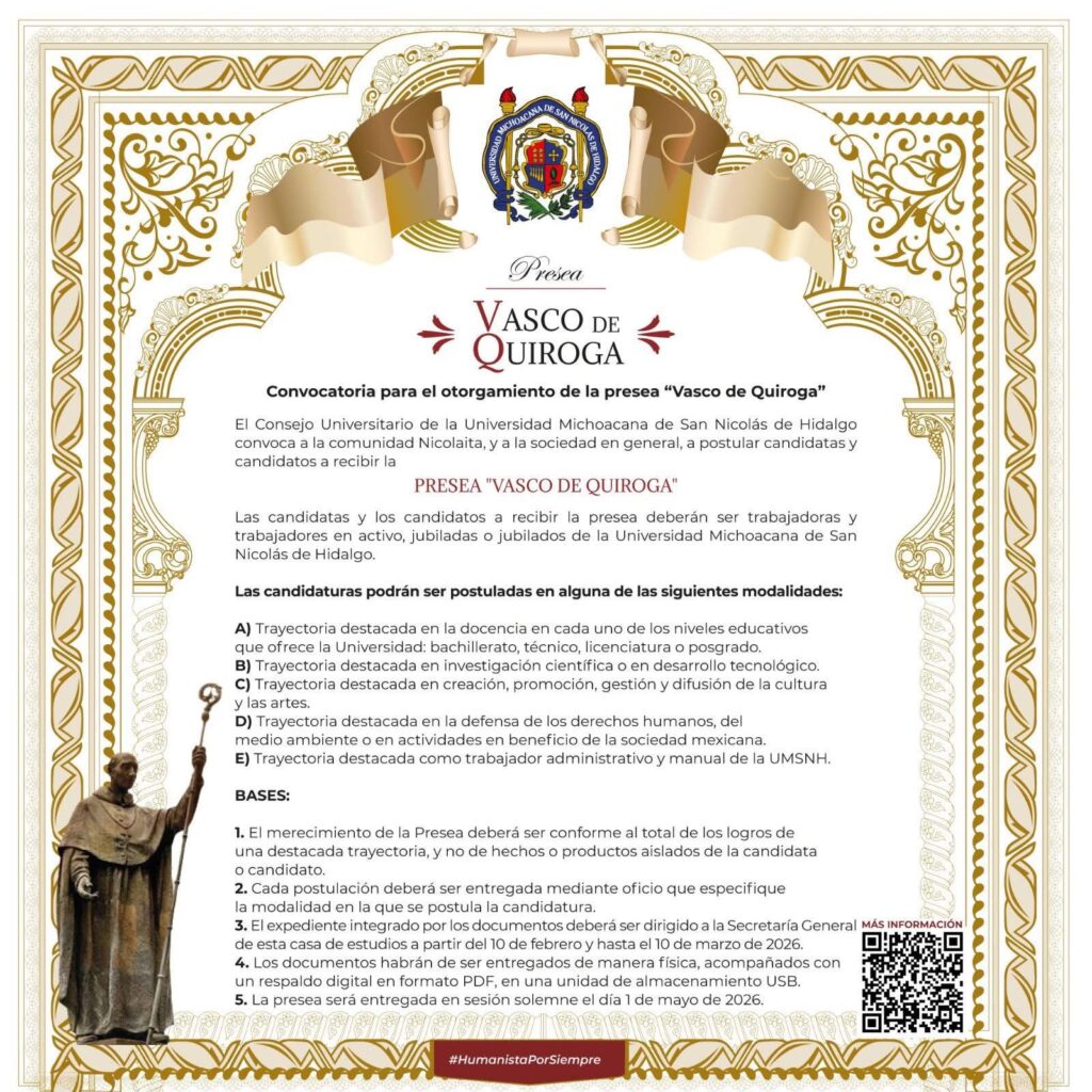 La Universidad Michoacana de San Nicolás de Hidalgo (UMSNH) convoca a la comunidad nicolaita y a la sociedad en general a postular candidatas y candidatos para recibir la Presea “Vasco de Quiroga”, distinción que reconoce trayectorias ejemplares alineadas con el humanismo que caracteriza a la casa de estudios.