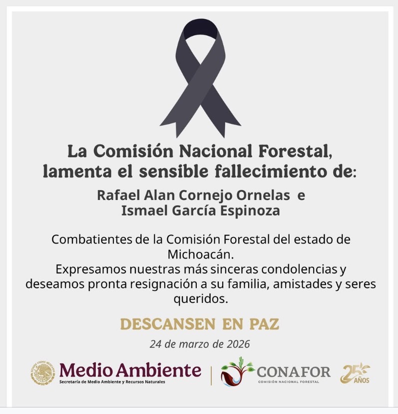 La Comisión Nacional Forestal lamentó la muerte de los brigadistas Rafael Alan Cornejo Ornelas e Ismael García Espinoza, quienes murieron la noche de este lunes cuando combatían un incendio en el camino a la laguna, en Tacámbaro.