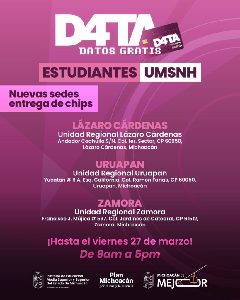 Para acercar los beneficios del Programa D4TA Datos Gratis a todas las regiones del estado, el Instituto de Educación Media Superior y Superior del Estado (Iemsysem) invita a estudiantes de la Universidad Michoacana de San Nicolás de Hidalgo (UMSNH) a conocer y acudir a las sedes habilitadas en el interior del estado para recoger y activar su chip con internet gratuito.