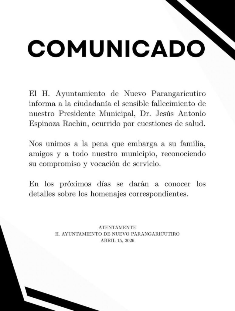 “El H. Ayuntamiento de Nuevo Parangaricutiro informa a la ciudadanía el sensible fallecimiento de nuestro Presidente Municipal, Dr. Jesús Antonio Espinoza Rochin, ocurrido por cuestiones de salud.