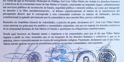 Declara Consejo Supremo Indígena persona “no grata” al edil del municipio de Hidalgo